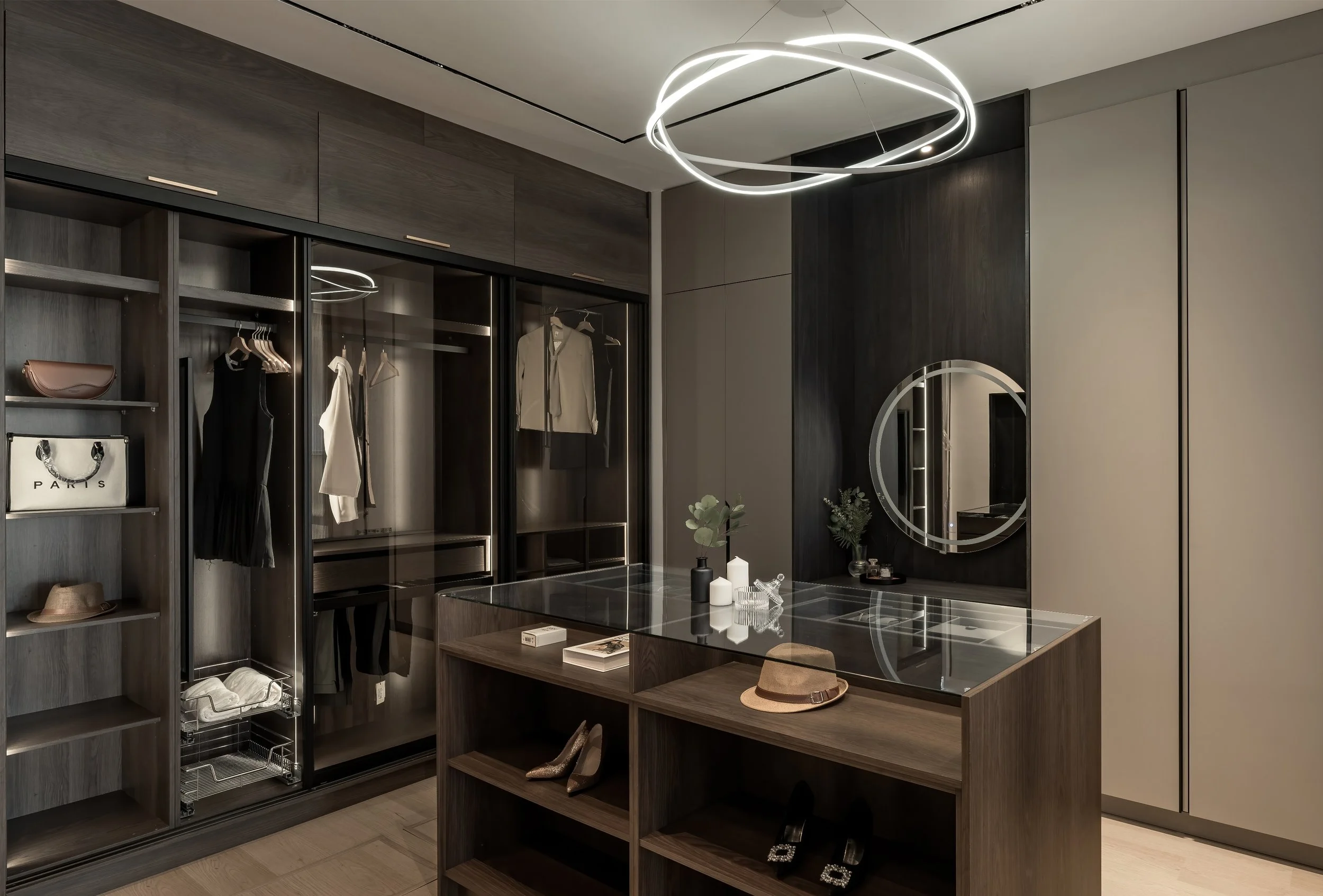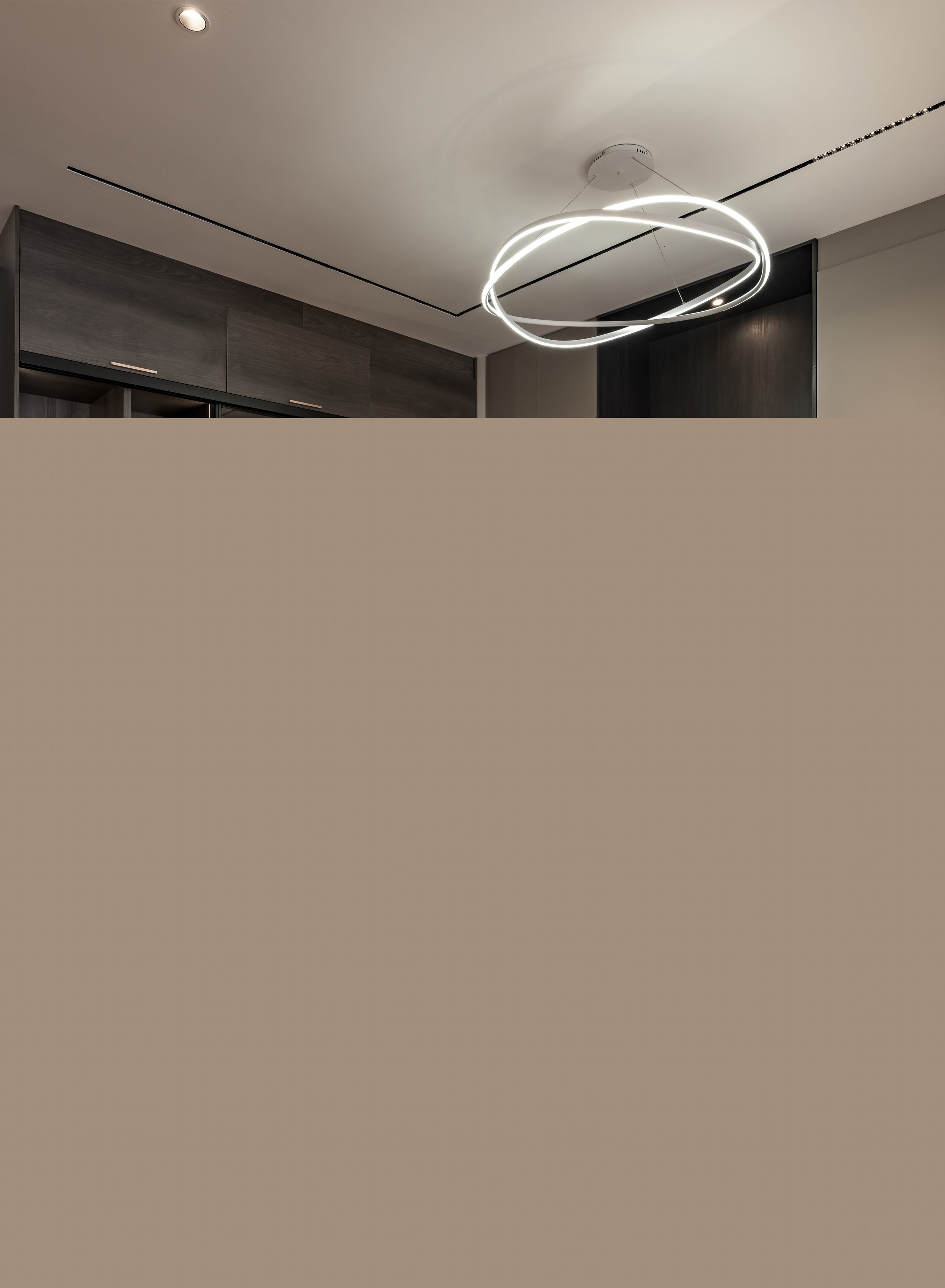 The interior design across the property showcases a modern contemporary aesthetic, characterised by clean lines, muted tones, and a cohesive material palette featuring wood, matte finishes, and black marble. Thoughtful lighting—from recessed strips to ambient shelf highlights—enhances both functionality and mood across spaces. Curved and circular design elements, especially in the play area, soften the overall look and add a playful charm, while sleek, high-gloss cabinetry and minimal decor keep the kitchen space refined and elegant. The blend of luxury accents like gold-framed furniture with cosy, lived-in touches creates a space that feels both stylish and comfortable.