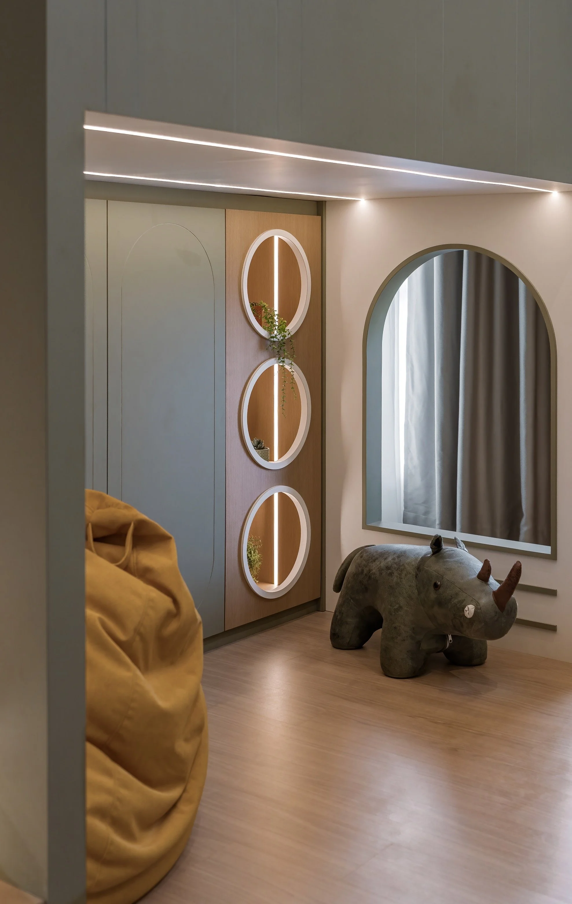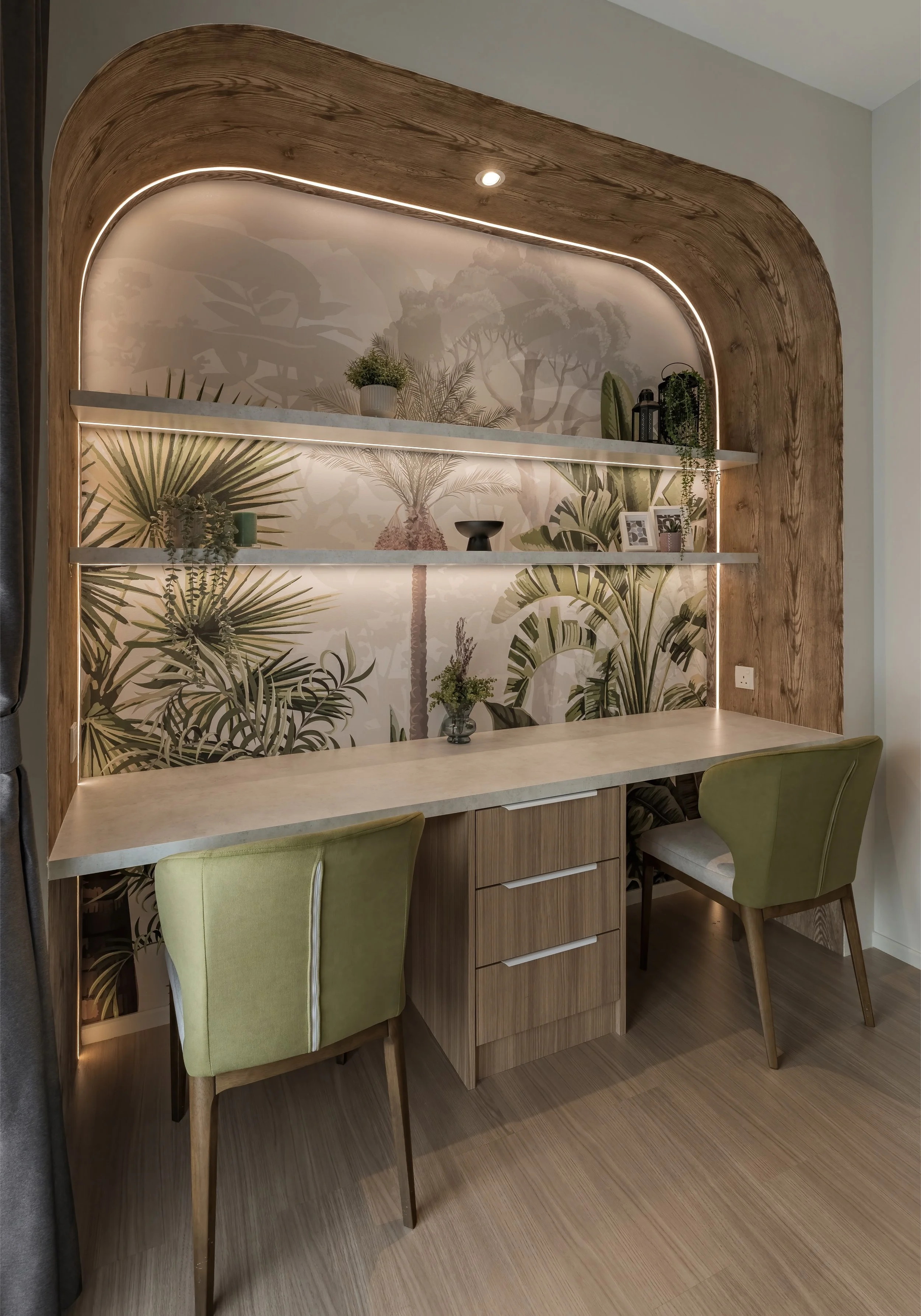 The interior design of this property embraces a warm, playful, and modern aesthetic with a strong emphasis on natural tones and soft, rounded forms. Throughout the spaces, there's a consistent use of earthy colours, wood finishes, and organic shapes that create a cosy yet contemporary atmosphere. Thoughtful lighting design—like the subtle strip lights and illuminated shelving—adds a sense of depth and sophistication.