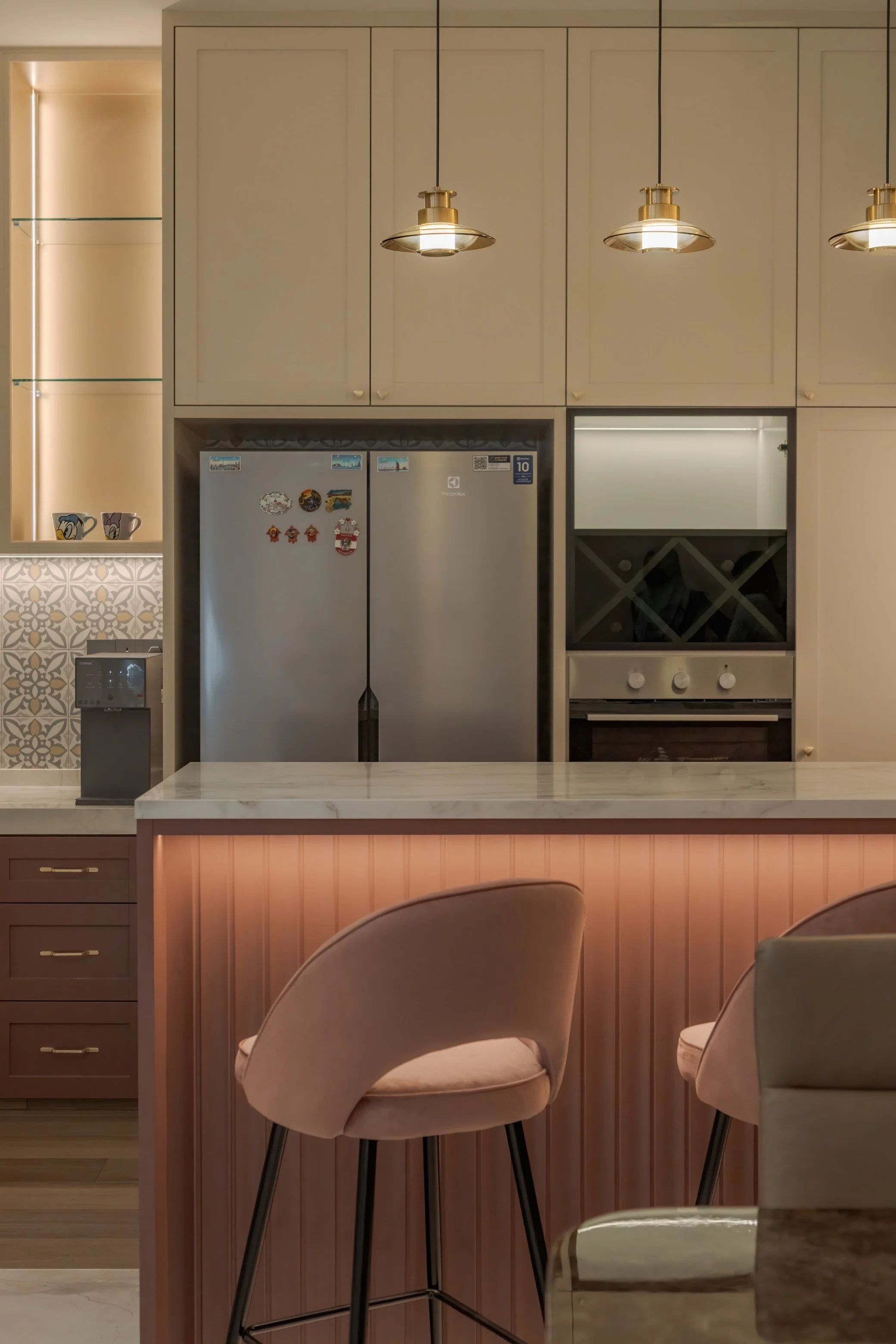 The space feels balanced and sophisticated, blending clean lines with natural textures and subtle lighting to create a comfortable yet stylish environment. The open layout, suggested by the bar counter, likely encourages interaction and flow with adjacent living areas.